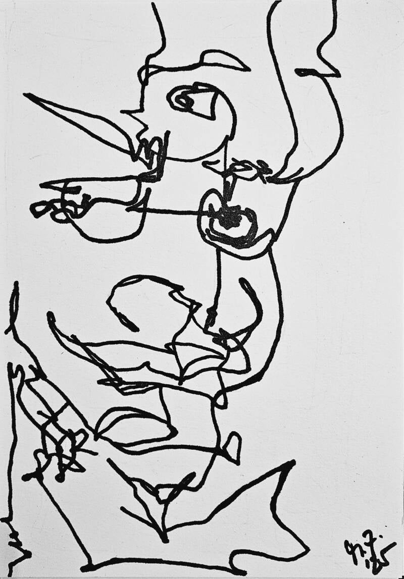 Das Zeichnen mit geschlossenen Augen im Sinne des Intuitive Cubism manifestiert sich in der (One) Line Art in nur einer oder wenigen ununterbrochenen, fließenden Linien, die komplexe Formen auf minimalistische Weise auf das Papier bringen.